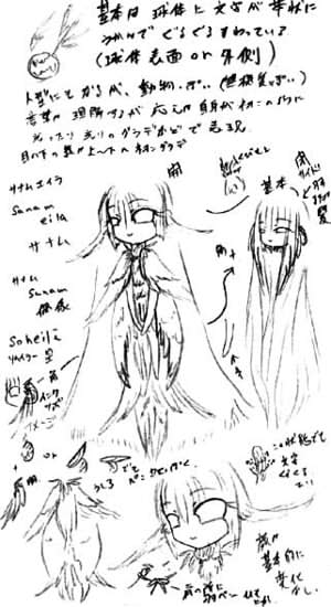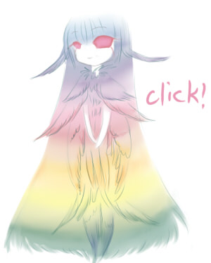 ++<口調>++ 本人自身が言葉を発する事はない。笑うことはあるが、楽しいから笑うのかも不明。 ++<外見>++ ・身体のベースは白(絵は濃い目。また全ての表示色を使用中。色はベース色以外も使用) ・球体。姿は不定らしく、球体の周囲に羽が浮いた姿や羽人形型が基本。 ++<性格・性質>++ ・言語機能はあるようだが、声や物音をたてることはない。 ・にこっとしたりはするが、自我らしいものがあまり感じられない。 ・属性は『風』か『水』だと思われる。 ++<職業>++ ・羽ペンのインク? ++<家庭>++ ・シェナは主。 ・ |