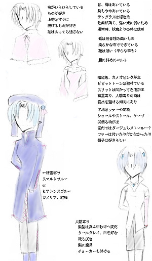 常識を求めてはいけない。本能で生きてる人。 外では『冷淡・冷酷・天然・友好』と変化。気まぐれ。 ++<外見>++ ・毛先に向かい白から蒼、薄青みがかった灰色に変化する髪。少々つり上がり気味の三色の瞳。 ・纏う力の色は【蒼】【白】 ・やや童顔。女性と言うより少年。 ・どこか諦め、冷めたような、見ようによっては哀しげな印象も受ける無表情。 ・服装に頓着しない。室内着も寝巻きも外出着も基本的に形は一緒。 ・体つきは女性的だが、態度などはダージュ以上に女性らしさ無し。 ++<性格・性質>++ ・非常にマイペースかつ、天然ボケ気味。 ・かなりの気分屋。やや非常識。短絡的思考。無気力無関心。 ・考え方、発想が突飛すぎて、理解に苦しむ。興味のある事には、しつこく食い下がって質問。 ・無意識に、人との精神的距離をとりがち。 ・女性、子供には好意的。 ・言動とは裏腹に、気性は激しく、かなり短気。 ・表情、声に変化が少ないので、落ち着いているように見られ事も。 ・何があろうとマイペースで自由だが、弟妹の事に関しては姉として動いているつもりらしい。 ・酒にはとても強く、ほぼ酔う事は無い。 ・考え、行動が精霊寄りのため、自身の身体に執着が無い。 ・エシュタリア大陸と精霊質が相性が良く、自世界に居る時より精霊質が優位。 ・『力』その物はダージュやエフェルター達を遥かに凌ぐが、制御が壊滅的にダメ。 ・ダージュが『癒し』なら、ユーラは『再生』、ツァリーアは『破壊・真実・混沌』 ・簡単な漢字の読み書き。精霊言語は理解可、ある程度しゃべる事もできる。手話は簡単なものなら理解可。 ・隠されているもの、目に見えないものを見る瞳を持つ(喜怒哀楽、本心などは感覚、経験でなく見て知る) ・瞳の特性とは別に精霊人としての感覚で力の流れなどもみえている(常に人間と多少異る見え方) ++<職業>++ ・飲食店兼酒場のウェイター、調理師、被服関連。 ・魔法剣士を名乗るが、エシュタリアでは会話中は「無職」と答える。 ・魔法剣士としては中、剣士としては上の下。 (上・中・下・一般の順) ・魔法士としては下の上、精霊使い(風)としては上、暗殺士の上の中。 ・平均としては中の上、エシュタリアでは平均、上の下、ウァスアルドに居る時より平均すると強い? ++<家庭>++ ・料理は好きなので料理担当。(最近はそれ以外は気乗りしないので、滅多にやらない) ・ダージュからは「危険人物その2(1)」エフェルター以下からは「姉」 ・「先の行動の読めない不思議っ子」 エシュタリアでは稀に「ダージュの保護者」に見られる。 ・ツァリーアが「嫌」と言ったら、特定の人物以外からの説得は難しい。 ・父ツァーク、母ミンシャ、義兄にユーラ、妹にダージュとティエラ、弟にエフェルターとラウトという認識。 以前は家事の全てを一人で負い、病気でも弟たちの食事を作るような状態だったが、ダージュが落ち着き、また家事協力者が増えたので、今は逆に放棄する事も。 鷹亭などで出会った人のことは、帰るとすぐにダージュなどに話すので、ツァリーアに知られた事は、ダージュやリューハにも伝わります。 |