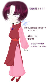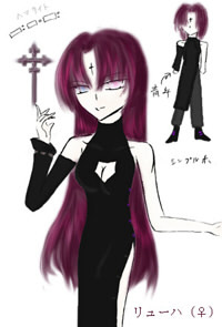 桜色、クラウドブルーの瞳に暗紅色の髪を持つ。基本的に少年姿の魔物。 左にのみ羽が生えている(羽というより硬質で透き通った骨?のようなもの) 本来の瞳の色は桜色で、羽根も対で存在する。 外見年齢はツァリーアの動きに合わせて変える。 現在は大体12・3歳〜15・6歳くらいの姿。小さい時の身長は160〜170cm。 外で居る時は15・6歳(プロフ絵の状態) 一時期のなり茶ではツァリーア姿で、その後190cm 17・8歳の姿で行っていた。 人の身体を乗っ取ると、瞳は鮮紅色か暗紅色に変化する。 (その本人の元の色や姿をそのまま使用することも可能) ツァリーアの身体を器とした場合は、精霊としての力の殆どを小物(アクセサリー)に変化させ、羽も無くなる。 小さい時(少年時)の服は、ツァリーアの人化時と同じようなのの黒。 大きい時は黒いシャツに黒いズボン 女性型、子供型の時は露出度が低めになる。 子供時の服装はティエラやミンシャなどの好みが反映されやすい。 女性型で居る時もあるが、基本的に男の格好 理由は「人が多い所はこっち(男)の方が面倒が起きねぇんだよ」とのこと。 やはり、多少は腕力などに差が出るらしい。絵は上の□です。 ⇒能力 剣は刀身の黒いソード。形はリューハの気分で変わる(長さ等も) 使用する人物の制御能力、その他の技量によっても形は変化するらしい。 人型と剣は別々になる事も出来るらしい。 別々でも剣が傷ついたり、剣状態で傷ついたりすればもちろん人型のリューハにダメージがある。 剣と人型どちらも本体らしい。 |