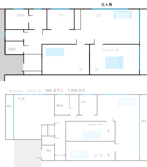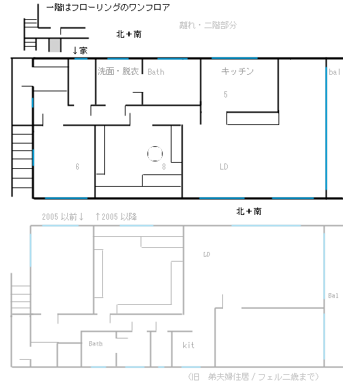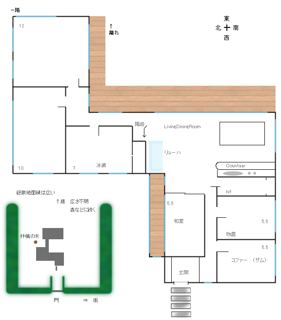 ←クリックすると元の大きさで表示されます。 一階 玄関を入ってすぐに元ザムザイトの、現コファーの部屋がある。 和室、トイレ、キッチン、リビングダイニング。 観葉植物等が置いてあったりするが、特にこれと言った特徴は無く、いたって普通。 ただやはり一階のソファはリューハ専用。 庭側に、離れまでの渡り廊下兼ベランダがある。 和室を除き、フローリングの床。 |