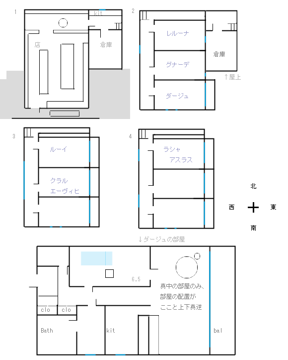 一階は店舗。 雰囲気は雑貨屋さん。 奥に店員が、お茶とか飲んでのんびり店番してる。 ダージュやルーイが働く前からある店。 改装等している為に外観、店内等は新しいが、やはり妙に広い。 防犯上の理由から、店の入り口以外からは出入りができずやや不便(魔師には関係なさそう…) 一階の奥に、倉庫や二階に通じる階段等がある。 倉庫は一階より二階のもののほうが、質が良かったり珍しかったりする。 各部屋、ちょっとしたマンション並みの広さがある。 一番南側の部屋には、キッチンと洗面所に小さな窓がある。 あとは、東側にのみ窓。二階の二部屋をのぞき、バルコニー。 廊下に棚があり、各自宛ての手紙やちょっとした書類入れがある。 この棚を使い、連絡や各自店員同士の頼まれごとをこなしたりする。 (頼まれた本入れておくとか、出来上がった魔具を入れておくとか) 二階のみ棚は無く、直接部屋の前に置く事になっている。 基本的に、相手の生活には口を挟まないのが暗黙のルール。 ダージュとルーイが仕事上対立する事が多い以外は、特に仲良くも無く、悪くもなくな関係。 ほぼ全員が、自分の先生や師匠の紹介等でここに来、それぞれの代わりにここに定住、といった感じ。 二階 レルーナ(フィレルナ)、グナーデ、ダージュの部屋がある。(この階、レルーナのみ男性、あとは女性) グナーデは居候先が、他の二人は、それぞれに家があるためここに居ない事も多い。 その為、他の部屋と比べ、あまり生活感はない。 (ただ、ある事件があってからエシュタリアに迷い込むまでの間は、ダージュはここに居る事が多かった様) 二階のみ、倉庫があるために、ダージュの部屋以外にバルコニーが無い。 ただし、倉庫の屋根部分が屋上になっている。 防犯上の理由から、部屋からのみ、屋上に出られるようになっている。 三階 ルーイ、クラリエルとエーヴィヒが生活。(この階は、ルーイのみ男性、あとは女性) 二人ともここを自分の家として定住している。 四階 術師クラシア(ラシャ)とアスラスが生活。(ラシャは女性、アスラスは男性/雄?) 二人ともこの部屋を自分の家としているが、忙しいのであまり帰れずにいる。 屋根裏部屋 物置となっている。封印済みの小物が多数あるとかないとか。 |