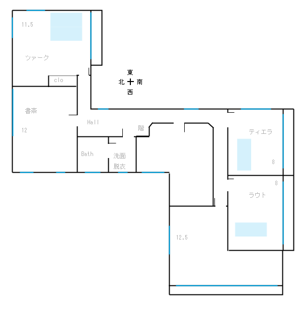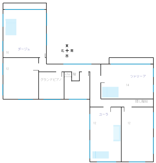 二階 洗面所とバスルームがある。 部屋は大きく分けて7つ。 書斎とツァーク達の寝室と、ティエラ、ラウトの部屋がある。 一部の部屋にバルコニー。 ティエラの部屋は、可愛らしい女の子らしい部屋。 ラウトは空を連想させるようなものが多い。 (この二人は、エシュタリアでも同じような雰囲気の部屋) |