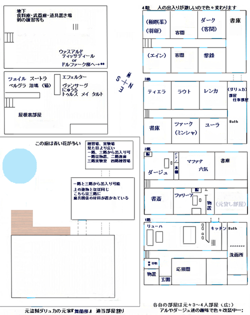 元の世界の家より、総敷地面積は狭いが、建物面積はこちらの方が広い。 元々この家を借りていたダリュカの元の職業柄(?)いたる所にえげつない罠あり (大怪我するような罠は一応はずしてあるが、変なところから入ると危険かも) 結界(見た目変化無し、人が入ると中の人に分かるようになってる+…) リューハにより、夜の11時に『鍵』が閉められる。 (ダージュやツァリーア等以外、自力で解除出来ない/魔法だから) ダージュの結界の選別により、知り合いはどこから入っても多分無事。 普通の家です。 ただ無駄にだだっ広く、無駄に部屋が有り、無駄に仕掛けがあります。 恐ろしく広い、としか言いようが無いほど広い。 庭にある建物はちょっとした家程度の大きさ。 ダリュカの盗賊仲間や暗殺仲間(?)が大勢暮らしてた所(アジト)だったので広いのです。 家は元々借家。 ダージュが来た時に持ち主であるダリュカの知り合い(テルシェーン嬢)から買い取りました。 ダリュカには法外な値段を言ったらしいですが、ダージュにはそこそこの値段で売ってくれたみたいです。 (それがどういった経緯かは謎…) 現在では隣の土地まで買い(?)、恐ろしく広くなりました。 家の改装や増改築はダージュ、アルの気まぐれで行われます。 個人の部屋は、その部屋に住む者の自由に使用。 全然関係無いけど表札には大きく「舞蘭」と書かれた表札。 最近はその下に「ドルファーク」とも書かれています。 きっとツァリーアあたりが手書きでちょちょっと書いたんだと思います。 (ダージュは元世界の知り合いに、ここに居ることが知られたくないのもあり、表札に名前は出してない) 大元は下宿屋みたいな建物、盗賊の隠れ家を経て現在の状態へ。 |