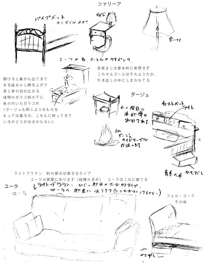 各部屋ごとに仕掛けがあるらしい。ある事をすると防音設備もばっちりに その状態では部屋に入ると、外の音はまず殆ど聞こえません。 特に、廊下から部屋の中の音は聞こえない。 全部が全部完全防音ではなく、普通より多少音が漏れにくい程度の部屋もある。 共有部分以外は個人の趣味で統一。 個人の部屋が一つの家のように、がらりと内装イメージがかわる。 『家族』で住む家、というよりは『宿』のイメージが強い。 庭 何故か池があり、何故か家が立ってる。 両方とも一階、三階から出入りが可能。(繋がってる) 家(小屋とは言え無い)手前の建物は、殆どダージュの私物と化している。 一階は物置。術、魔法関係であまり使わないものはここに保管されている。 二階は書庫。あまり読まないもの、重い魔道書とかはここ。 三階は実験室。奥の建物にフェルが居る時はダージュはこちらにいる。 四階は強化され、術の練習場となっている。主にツァリーア、ダージュが使用。 ちなみに時々総入れ替えされるところだったりする。 奥の建物は手前の建物より少し小さめ。 一階は物置。単なる物置。 二階は書庫。あまり読まないものはここに。 三階は実験室。ダージュが色々試している部屋はここ。 四階は強化され術の練習場。主にフェルが使用。何故か遊び場になっている。 庭には花が多いです。しかも蒼い花。淡い色の花が多い。 桜、沈丁花、林檎、金木犀などの木も植わっている。 花壇の世話はダージュやエフェルター、ラウトが趣味で行う。 部屋家具等 一階家具 各自各イメージなどはこちらのページ 一階 共有スペース 一部を除き、さほど防音にはこだわっていない。 洗面所には全自動乾燥機つき洗濯機がある。 キッチンは度々小規模破壊される。多分一番破壊されている。 基本的にツァリーアが仕切る場所。 オーブンやら巨大冷蔵庫やら設備はなかなかのもの。 ツァリーアはそこそこの物でいいと思っているが、 ダージュやアルが変にこだわっている模様。 カウンターテーブル、テーブルがある場所は全面ガラス窓。 庭が良く見える為、時々ツァリーアがぼ〜っと外見てる。 ツァリーアは自室よりも、ここに居る事の方が多いかも? ソファはかなり大きめ いつもリューハが寝転んでいる。(家にいるときはここに居る) 食料庫が下にあるので床にある扉を開けると 直接地下に行けるようになっている。 勝手口あり。渡り廊下状態になっていて屋根もついている。 玄関は段差がそんなに無いイメージ。階段も広め。開放的。 隣の物置には武器も入っているし、靴も入っている。 整頓はされているがなかなか混沌としている。 応接間はソファがあって…な、いたって普通の応接間です。 風呂は多分かなり広いと思う。シャワールームが別にあったりする。 二階 ツァリーア、マファナ、ダージュの部屋と書庫、書斎がある。 ツァリーアと書斎があるほうが玄関側。 書斎、書庫は分厚いカーテンが閉められ、外から様子は分かり難い。 バルコニーもある。書斎は物置の分他の部屋より狭い。 部屋使われている木は主にダークブラウン系。 一部屋を以前、他の方に貸していたらしい。 ダージュは二階の書斎に居る事が多い。 三階 ユーラ、ツァーク、(ミンシャ)、レンカ、ダリュカ、ティエラ、ラウトの部屋、 書庫がある。以前はダークの部屋もここにあった。バルコニーあり。 ダリュカの部屋は、装具、魔具製作等できる工房のような物。 一階にあるものよりは狭いが、バスルームもある。(ユニットバス?) ダリュカの部屋となっては居るが、本人の物はあまり置いて無い様。(居ないので) 護符などはここでも作る事が可能。 一階直通のエレベーターのような魔方陣があるらしい。 四階 エイン、羽斫&栩瞑茱、ダーク、黎銖の部屋、書庫がある。バルコニーもある。 客間もある。他特に無し。 一階直通のエレベーターのような魔方陣もあるとか… 屋根裏部屋 アル、エフェルター、スートラ、ツェイルの部屋 その他にヴァンサーグ、にゅうる、ベルグラ、泪璃、トゥルス、メイ、タルトが居る。 アルはこちらの世界に殆ど来ない(以前は居た) ワンフロアのだだっ広い屋根裏部屋は、絶好の遊び場所となっている。 その為、他の部屋より防音、壁、床の強化…と色々してあるらしい。 地下 絵そのままです。 食料がどさっと置いてあるわけではないのです。(当たり前) 地下一階が食料置き場等 地下二階が武器等置き場と扉 |