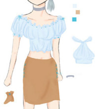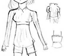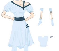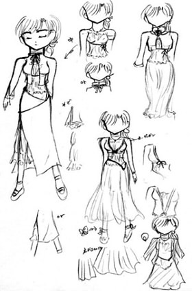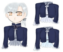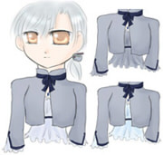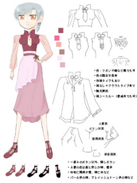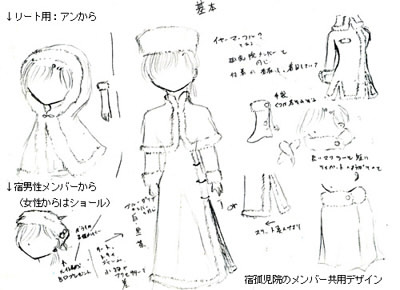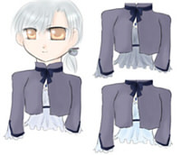 このページの絵は同窓表示です。 模様やデザインなど細かく指定していますが、適当に省略してやってください。 以下にある服などのデザインの中で、足したり引いたり組み合わせる事は可能。 模様を付け足したり、簡素にしたりする事も可能です。 後姿など、指定の無い部分はほぼ左右裏表対称で考えています。 宿の他の女性従業員の服を借りたりもする。 華美でもないが質素でもない、中途半端な服が多い。 ギルドの服もそうですが、絶対12世紀の中世ヨーロッパ設定にかすってない気がします…。 鞄やアクセサリーはこちら≫≫詳細ページ ギルド関連の服装はこちら≫≫詳細ページ ラフと書いてあるものは未着色、設定と書いてあるものは飾りなどの詳細があります。 現在の服装 現在の服装 :毎日変化していると思いますので、ご自由に色々着せてやってください。 共通服装 秋冬・防寒着:≫≫絵(設定、ラフ) 冬・防寒着:≫≫絵(設定、ラフ) / _色(外出着・現在) / _色(設定左端、色) 左端上は師匠であるアンに旅の為の防寒着としてもらったもの。 裏も毛皮になっていて暖かい。裏毛皮は着脱可能らしい。帽子の部分、身体の部分も分離してる。 左端下は誕生日に貰った帽子。所々羽根がついている。 女性達からは月白色■のショールを貰った。 真ん中と右側は宿の女性達と共用の防寒着。色は白、黒、茶。 イヤーマッフルや靴、マフラー、ティペットのようなものもある。 靴に関しては各自それぞれで持っている。 冬・防寒着(私服、ギルド用):≫≫絵(設定、仮着色) / 絵(完全防備) こちらの防寒着の丈は腰付近。活動服初期と同じ■色。 クラスチェンジ後に貰ったものは足の付け根よりも少し長い程度。 リート用に作った■色と師匠からのお下がりの■色のものがある。 こちらは毛皮だけでなく、フードその物の着脱も可能になっている。 向かって左の状態に、フードを外側から巻くように取り付ける(内側の毛皮部分を残すとより温かい) 帽子が内側で、ファー部分が外に出ていても構わない。絵:完全防備くらいまでが最高。 前の部分は内側で留める事できちんと閉じる事は可能。ボタンなどを隠したデザイン。 正装・盛装? 式典などの時に着るかもしれない服。 帽子をかぶるために髪を下ろし、向かって左側の1房をビーズで留める。 月光館 月光館の中での制服。 各人それぞれの体型や性格によって多少違いはあるらしい。 白系のシャツに黒に近い色のスカートを合わせる。 過去服装:その他は他の季節も着る服。再使用予定無し以外は私服。 08年春服:≫≫絵 胸元が開いたデザイン。腰の部分は2本線の×、靴の飾りも×紐飾り。 上着の裾の部分は重石を兼ねた飾り石ボタン飾り。靴下は太腿までの長さ。 07年春服(その他):≫≫絵(設定、ラフ) / _色 / _色 07年春服(その他):≫≫絵(設定、ラフ) 07年春服:≫≫絵(設定/メイン服) / +α 胸元は開いている物も開いていない物もある。 スカートは後ろ側が少し長めのデザイン。 右下隅の文章は上着に関しての設定。 07年夏服: ≫≫絵(設定) / 絵(設定) / _外出・チャット時 / _上着 / 左の絵は背中側。首と下でまた留まってます。肩、背中が開いています。ホルターネック状態? スカートは向かって右にスリット。腰にあるのは飾りの紐。丸いビーズで留まっている。 靴の飾り(丸いの)は左右両方にある。これもただの紐。 靴底を通る部分は2本の紐がまとまって、1本に見える状態。再使用予定無し。 07年夏服(その他):≫≫絵(設定、ラフ) 07年夏服(その他):≫≫絵(設定、ラフ) 07年夏秋(その他):≫≫絵(設定、ラフ) 07年夏秋服(その他):≫≫絵 / _その他 07年夏秋服(その他):≫≫絵 07年秋冬服(その他):≫≫絵(設定、ラフ) 07年秋冬服(その他):≫≫デザイン1、色 / 上着色違い / 上着色違い カラー絵では手が見えないが、設定ラフにあるように袖は邪魔にならない程度の長さ。 上着は初秋→晩秋〜初冬→冬のイメージ。もちろん自由に着まわしている。 メイン色の服だが、下の秋服と同じ色合いなどでも可。 07年秋服(その他):≫≫絵 / _型違い、詳細 袖の部分は手の甲側が長めになっていて手の平側が短い。 内側に曲がり手の甲、指に沿うようなデザイン。ローブの袖のようなイメージ。 リボンは中の服の胸下についている。 下に見えている、色違いスカート部は見える部分がもっと短くても可。 紅いスカート部は、春服のように外に巻くような型も。 上着と同系色のつばの広い帽子などを被る場合もある。 靴にはベルトがついている。甲のベルトはぐるっと下まで一周しているように見えるデザイン。 足元は白の靴下。ニーソックスでも踝まででも、色つきタイツやストッキングでも可。 07年冬服:≫≫絵 06年夏服:≫≫絵(設定/メイン) 腕の部分は前後に同じ切れ込みと飾り紐がある。 外出時には月白色のショールなどを持っている。 ×紐終了地点からスリットが始まる。太腿部分の飾りはぎりぎり見えるか見えないか。 靴の切れ込みと飾りは両側についている。 06年夏服:≫≫絵(色設