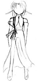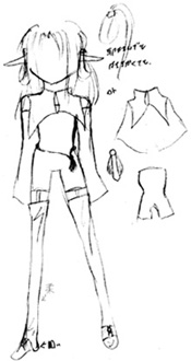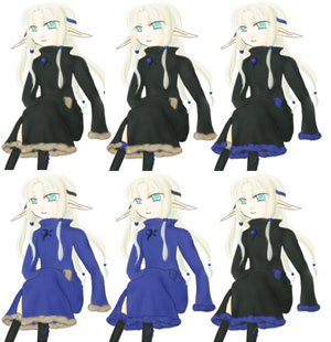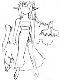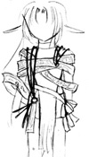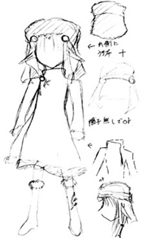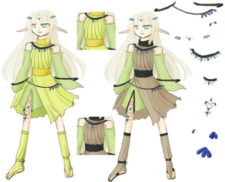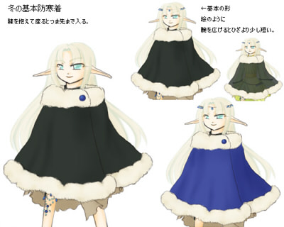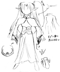 このページの絵は同窓表示です。【⇒Click】で詳細説明が出ます。 細かく指定していますが、適当に省略してやってください。 以下にある服などのデザインの中で、足したり引いたり組み合わせる事は可能です。 模様を付け足したり、簡素にしたりする事も可能です。 後姿など、指定の無い部分はほぼ左右裏表対称で考えています。 私服はこちら≫≫詳細ページ 私服をギルドの活動着として使用することもあります。 (活動着として使用しないと明記されているものを除く) 髪型の適当に変えてやってください。例は服設定や表情設定を参考に自由にどうぞ。 とても見辛く使ってくださる予定の方には申し訳ないのですが。 【活動服】 【武器】の順で並んでいます。 設定している本人があまり深く考えずに装備させているので、お好きなように組み合わせて装備させてくださるとありがたいです。 ラフと書いてあるものは未着色、設定と書いてあるものは飾りなどの詳細があります。 基本活動服 【基本活動服】、【戦闘外活動服】を状況に応じて使い分けています。 服ごとに髪型が異なっていますが、服の型=髪型ではありません。 基本全身設定:≫≫絵(設定、ラフ) / 絵(基本色) / 絵(色違い) / 絵(内側、ケープ無し) 寒冷地などでも使用できるだろう予定の活動服です。 防寒具が必要な場合、上着部分の材質と丈を多少長くするなどして対応する予定です。 中のワンピース部分は『その他の基本色』の中などで自由に色を変更。 リボンの輪の部分は1つだけ。片結びです。 基本全身設定:≫≫絵(設定) 基本全身設定:≫≫絵(装飾無し) / 絵(黄色メイン、色違い) / 絵(薄茶メイン、色違い) 装飾が多めの活動服です。 胸元の飾り数、膝付近や足首の飾りの有無は変更可能。 額の中心の飾りは丸みを帯びた雫、その他は縦長の雫。額飾りは前面のみ、一周、どちらでも可。 胸元の飾りは雫。雫の両脇に丸い飾りが▽に配置されている。中心に一組か飾りが一周する形。 袖の飾りは内側に丸ひとつ。飾りの部分で紐が固定されている。 腰の部分の飾りは雫と丸が交互になっている。飾りと逆側で服に固定されている。 表から見える雫は5個、全部で9個。丸は4個、全部で8個。 足首は雫型の飾り3個。下向き扇型に配置されている。 基本全身設定:≫≫絵(基本) 基本全身設定: ≫≫絵(基本変化) / _(肩部分有無) / _(タイトスカート) 基本全身設定:≫≫絵(リボン、ブルー) / _(グリーン) リボンがメインになる活動服です。 リボンの輪の部分は1つだけ。片結びです。(肩、腰は普通のリボン型でも可) 基本変化絵は頭にリボンが付いている絵、胸元のリボンの数、肩やスカートの部分の透け具合。 リボンのメイン色の変化はブルー=■色、グリーン=■色。 ■色リボンの位置が緑、蒼と同じ位置でも可。 下のスカート、肩の透けた布、髪の飾り、それぞれの有無。リボンを巻く形にへの変更可。 靴の部分のつくりは私服の靴と色違い同型です。 袖の部分や前の部分に装飾を加えるなどの変更は可能です。 寒冷地活動服:≫≫絵(設定、ラフ) / 絵(色パターン) / 絵(基本色) 寒冷地などでも使用予定の活動服です。ファー部分と材質を変えると季節を問わない予定。 形はワンピース型として描いても可。 帽子は案のひとつなので、課題で使用する場合は帽子は無しでお願いします。 寒冷地活動服:≫≫絵(フード、ラフ) 冬・防寒着(私服、ギルド用):≫≫絵(設定) 色は■色、■、■。ブローチは飾り。立派に防寒着としての役割は果たしている。 自分が寒いと感じるから着る、ではなく最低限凍死しない為に着ている。 髪は顎の上付近、脇の下付近、ウエスト部分付近で束ねています。 前サイドにある束と後ろサイドの髪束を一緒にまとめ、前にたらしています。 後ろの髪は二つ分けです。≫≫詳細ページに図があります。 服装の基本は手が出ていませんが、袖を短くしたり腕を出す服に自由に変えて使ってください。 武器 杖:≫≫絵(設定・本人との対比) / 絵(基本色) / 絵(装飾) 課題使用例・使用基本色・ラフ設定服 基本の色は以下の色を使用。 服の基本色はシャルトルーズイエロー■ 、灰■ その他の基本色はアプサント■ 、アニ■ 、ヴァニーユ■ 、ヴェールニル■ 文様などの基本色はイリス■ 、ヴィオレ■ 、ロイヤルエールフォルス■ 、濃朽葉■ [設定絵・ラフ] 設定やメインでは使用しない服。着色済みの服は課題などで使用することは可能です。 〔設定絵:体型〕 春秋活動服:≫≫絵(ラフ) 春秋活動服:≫≫絵(ラフ) 春から初秋にかけてのイメージで使用する予定の活動服です。 春秋活動服:≫≫絵(ラフ) 春から初秋にかけてのイメージで使用する予定の活動服です。 夏服をベースに模様の入った帯上の布、紐、リボンなどが巻きついた服です。 春秋活動服:≫≫絵(ラフ) 春秋活動服:≫≫絵(ラフ) 春から初秋にかけてのイメージで使用する予定の活動服です。 装飾が少しごてごてしている服とそれをベースにした別の服です。 夏基本活動服:≫≫絵(